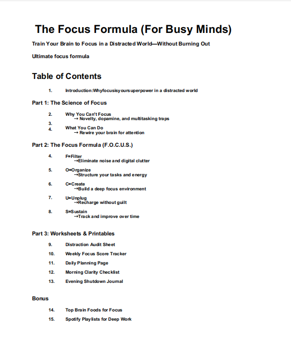 A science-backed, easy-to-follow guide to help busy minds regain focus in a distracted world. Includes a 5-step method, printable planners, and tools to help you stay sharp—without burnout.